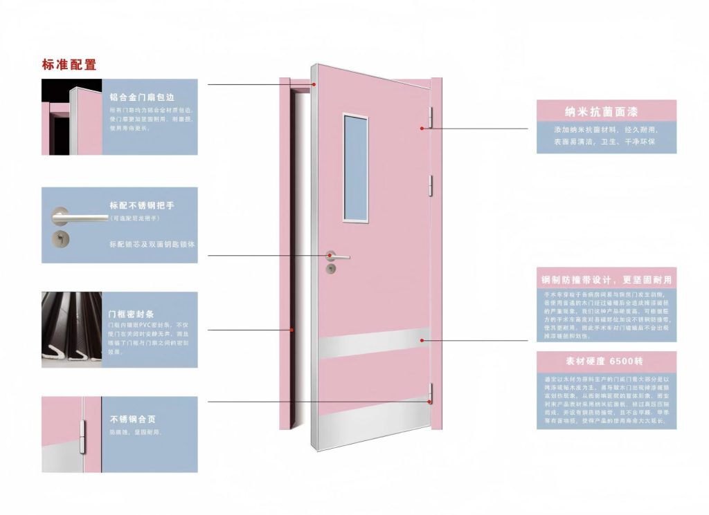 Our hospital doors are engineered for hospitals, clinics and nursing homes, fully complying with international healthcare hygiene, infection control and safety standards. Constructed with antibacterial, corrosion-resistant panels, the smooth, seamless surface is easy to sanitize and disinfect, effectively reducing bacterial growth and ensuring a sterile medical environment.